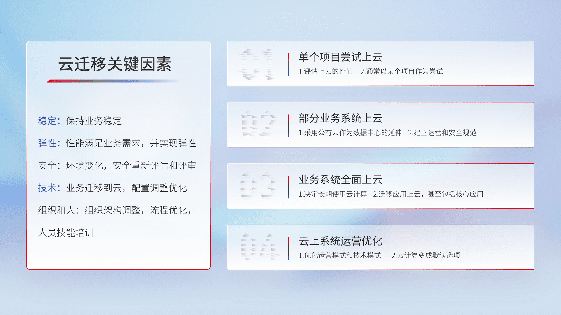 结合实际业务,,,从规划设计、、、、云平台选型、、、云原生改造、、数据迁移、、、集成交付,,,,迁移全过程为客户识别最佳上云路径,,,做好风险识别管理,,,,设计网络架构、、身份权限、、、安全审计合规、、、操作审计、、日志审计、、、监控告警策略、、、多站点容灾设计等,,对云上基础设施进行整体规划,,,提升IT治理水平,,以满足弹性、、、高可用、、、高性能的需求。。