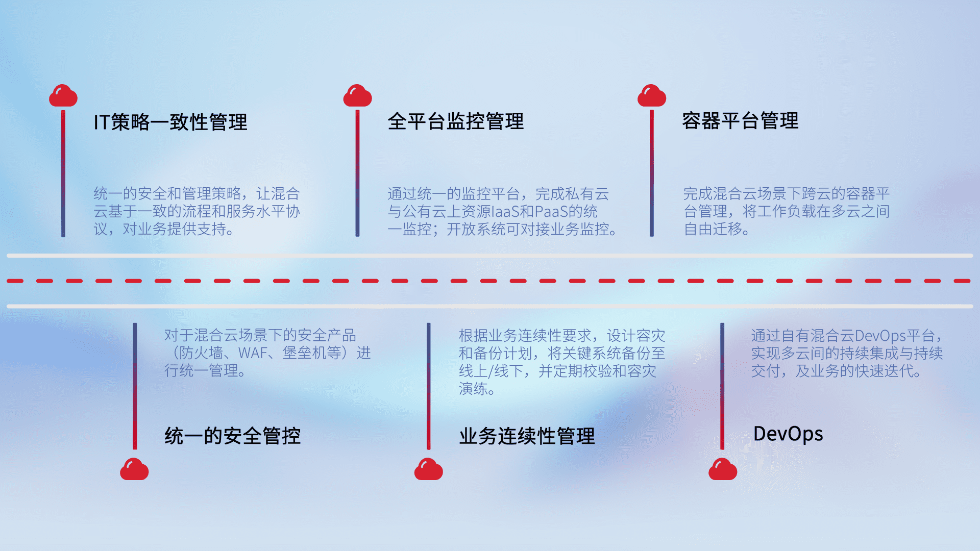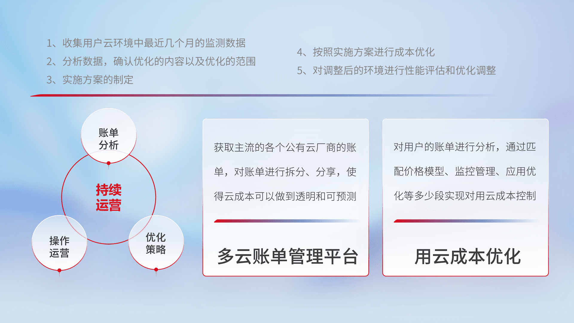 通过多云纳管,,,,以统一的资源数据模型把客户的云资源进行抽象和封装,,,,进而实现对多云资源的统一操作,,保障云资源管理的可靠性、、、稳定性与可用性。。。。量身定制化运维内容,,,配置、、、、开发运维、、、、补丁管理、、备份、、监控、、认证和访问管理、、、、审计和日常巡检等,,,保障在用云过程中的可靠度,,,稳定度以及高可用率。。。。