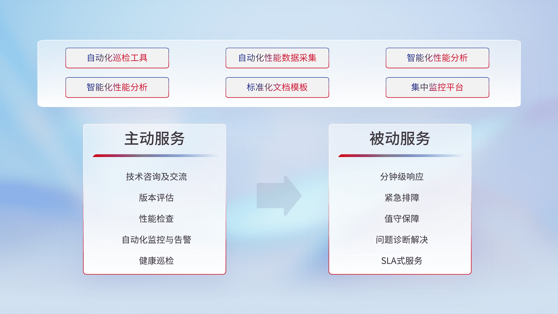智能化工具和标准化文档,,保障服务质量,,,提供主动服务(包含技术咨询、、版本评估、、、、性能检查、、自动化监控与告警、、、健康巡检)和被动服务包含(分钟级响应、、、、紧急排障、、值守保障、、、问题诊断解决、、、SLA服务)。。